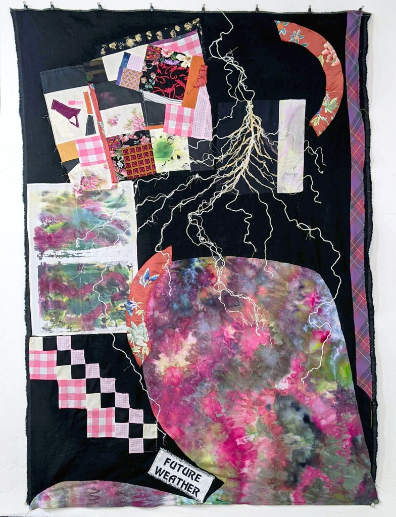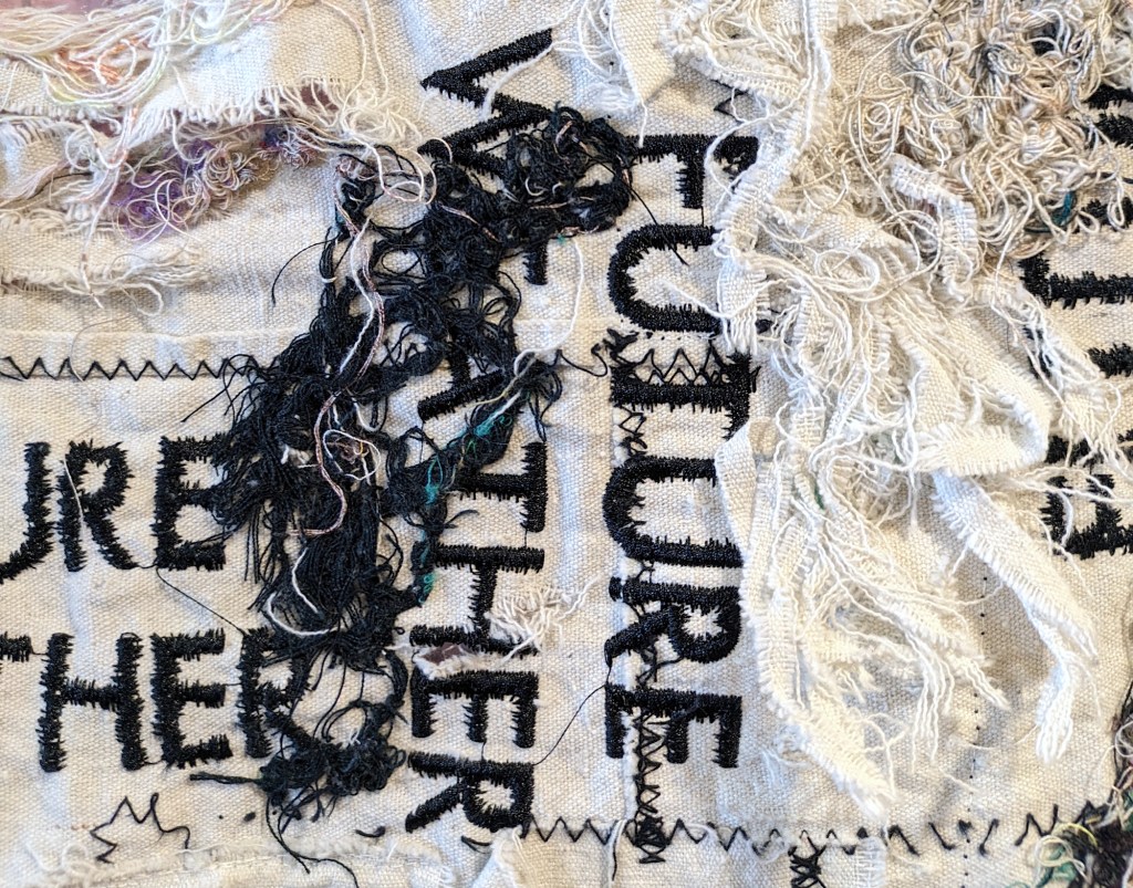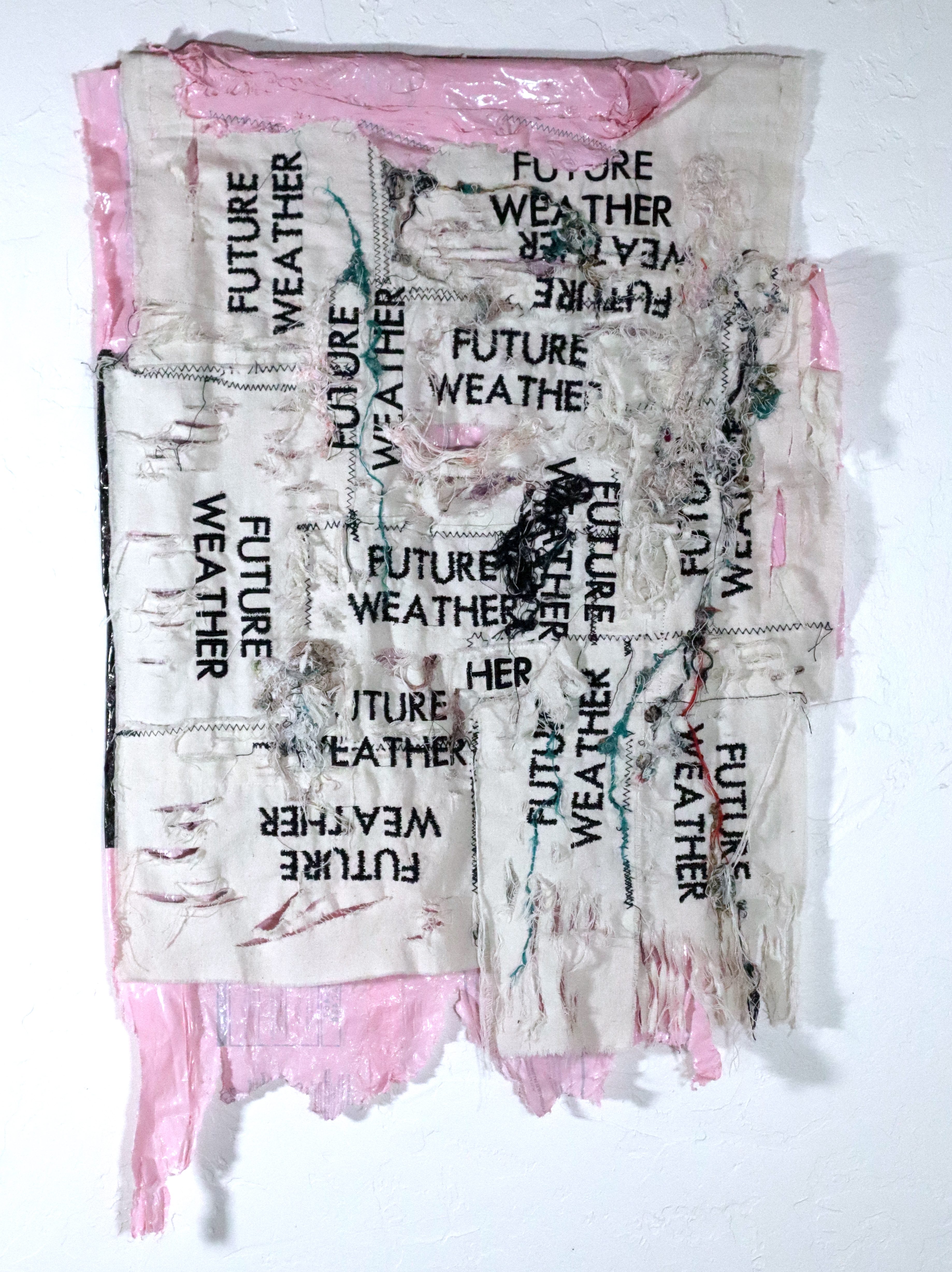 This piece combines machine embroidered text and hand distressed fabric with careful hand stitching, suggesting patterns of abuse/misuse and a relationship of care. I combined the textile with plastic packaging, litter, I found out walking in my neighborhood, which adds another layer, both conceptually and formally, to the questions and provocations in the piece. The careful handling of the textile suggests ways of relating to present day degraded conditions with care, attention and repair. The choices humanity makes, right now, on a daily basis, have real impacts. What future weather will we gift to our children?