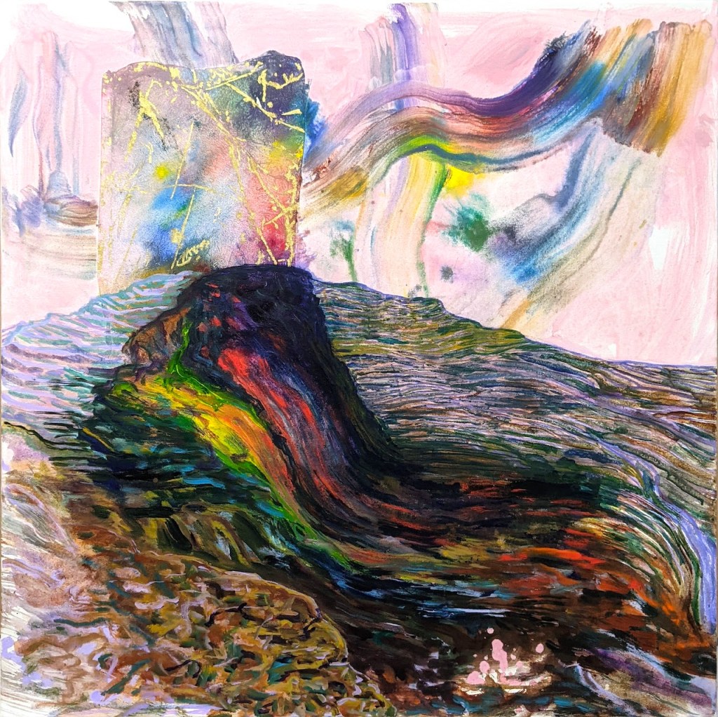 Spirit Mountain is Now Just a Pile of Poisonous Powder, 2021 36 x 36 x 1.5”, acrylic, monoprint and 23 karat gold leaf on canvas